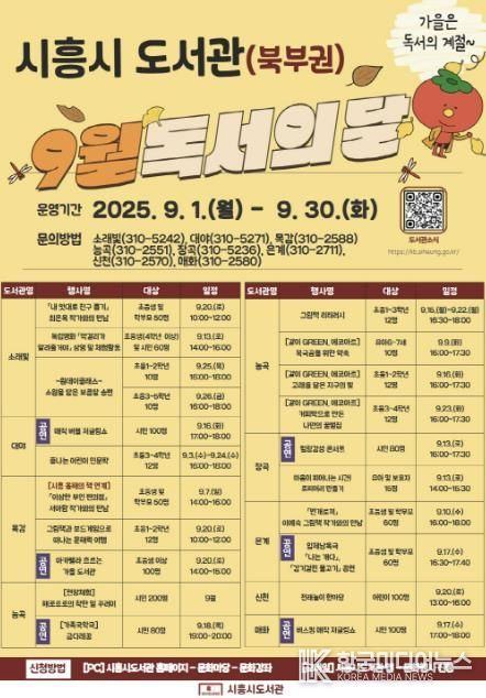 [ 한국미디어뉴스 이보영 기자 ] 시흥시 소래빛도서관을 비롯한 북부권 8개 공공도서관이 ‘9월 독서의 달’을 맞아 9월 한 달간 시민의 독서문화 환경을 조성하는 20개의 문화행사를 운영한다.