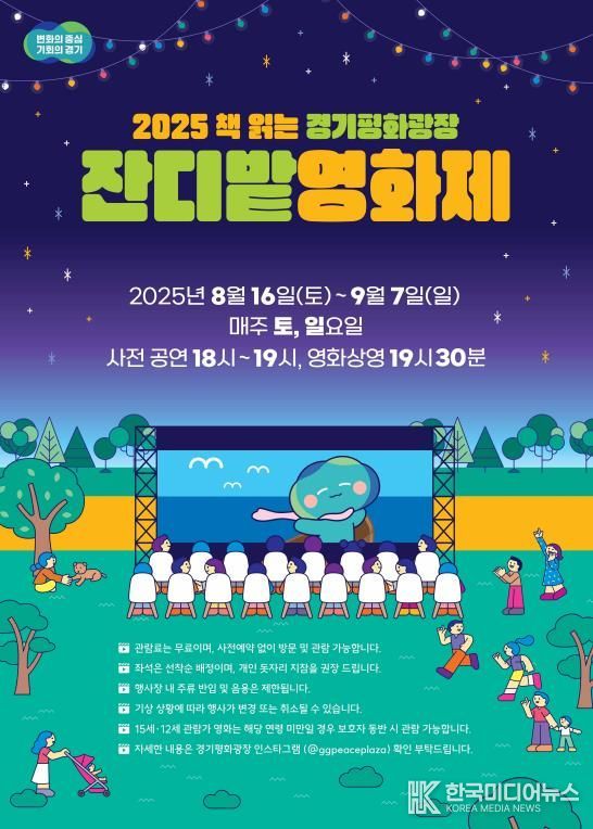 [ 한국미디어뉴스 이보영 기자 ] 경기도가 16일부터 9월 7일까지 경기도청 북부청사 경기평화광장에서 매주 토요일·일요일 총 8회에 걸쳐 ‘2025 경기평화광장 잔디밭 영화제’를 연다.