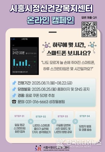 참여 방법은 ▲스마트폰 과의존 자가 점검표와 사용 습관 개선 방법을 담은 카드뉴스 확인 ▲참여자 본인의 일일 평균 ‘스크린타임’ 캡처 화면 제출 ▲본인만의 스마트폰 사용 줄이기 실천법 작성 순으로 진행된다. 참여 결과는 8월 25일 시흥시정신건강복지센터 누리집에서 발표된다.