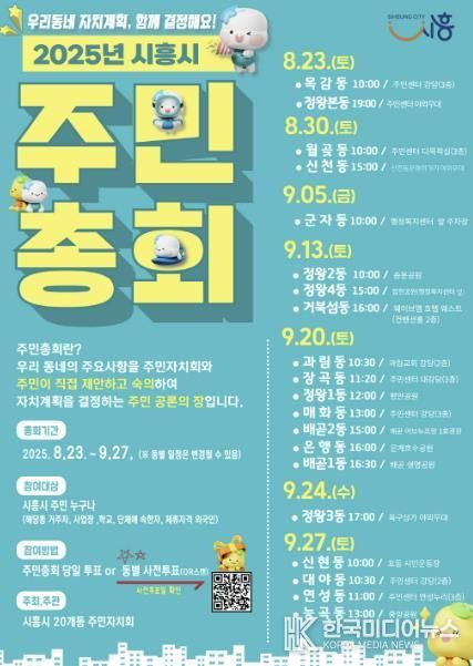[ 한국미디어뉴스 이보영 기자 ] 시흥시는 주민이 직접 마을에 필요한 사업을 결정할 수 있도록 ‘2025년 동별 주민총회’를 오는 8월 23일부터 9월 27일까지 20개 동에서 차례대로 진행한다.