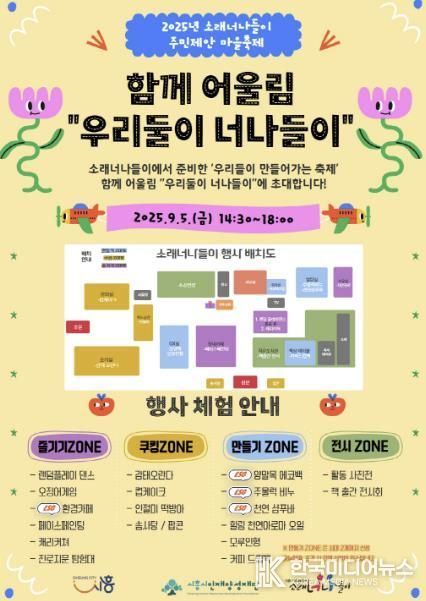 [ 한국미디어뉴스 이보영 기자 ] 시흥시 학교복합시설 소래너나들이센터는 오는 9월 5일 오후 2시 30분부터 오후 6시까지 주민이 직접 기획ㆍ운영에 참여한 주민 제안형 마을축제 ‘함께 어울림 우리 둘이 너나들이’를 개최한다.
