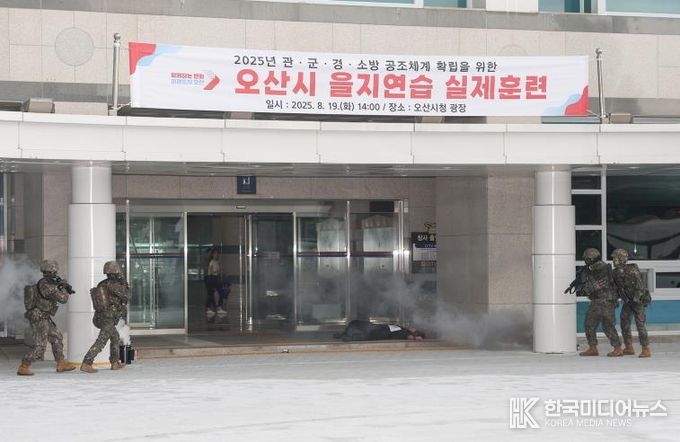 [ 한국미디어뉴스 이보영 기자 ] 오산시는 지난 19일 오후 2시, 시청 앞 광장에서 관·군·경·소방이 함께하는 ‘2025 을지연습 실제훈련’을 실시했다고 밝혔다.