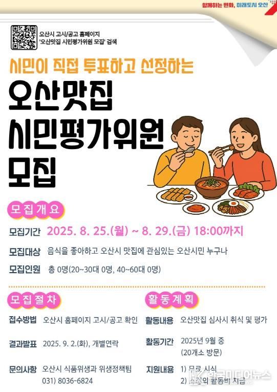 이권재 오산시장은 “시민의 눈과 입맛으로 평가하는 만큼 ‘2025년 오산맛집’은 더욱 공정하고 신뢰받는 결과가 될 것”이라며 “많은 시민들이 평가위원으로 참여해 오산의 진짜 맛집을 함께 발굴해 주시길 바란다”고 말했다.