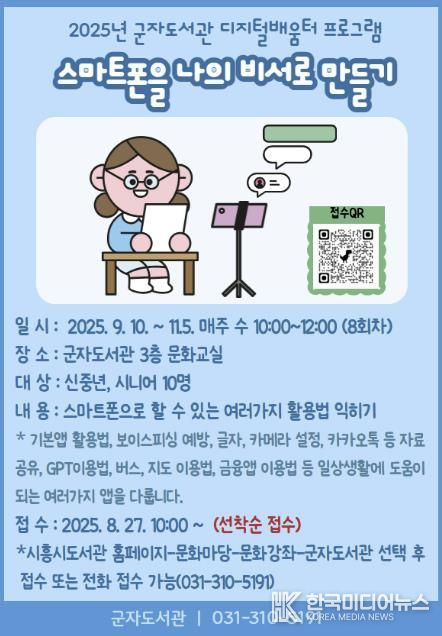 [ 한국미디어뉴스 이보영 기자 ] 시흥시 군자도서관은 디지털 환경에 익숙하지 않은 신중년, 어르신 세대를 대상으로 ‘스마트폰을 나의 비서로 만들기’ 디지털배움터 프로그램을 오는 9월 10일부터 운영한다.