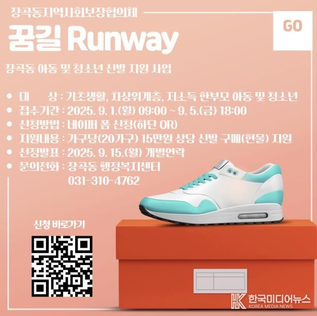 [ 한국미디어뉴스 이보영 기자 ] 시흥시 장곡동 행정복지센터는 장곡동 지역사회보장협의체와 저소득 아동과 청소년들이 밝고 건강하게 성장할 수 있도록 돕기 위한 맞춤형 신발 지원 사업 ‘꿈길 런웨이(Runway)’를 오는 9월 1일부터 추진한다.