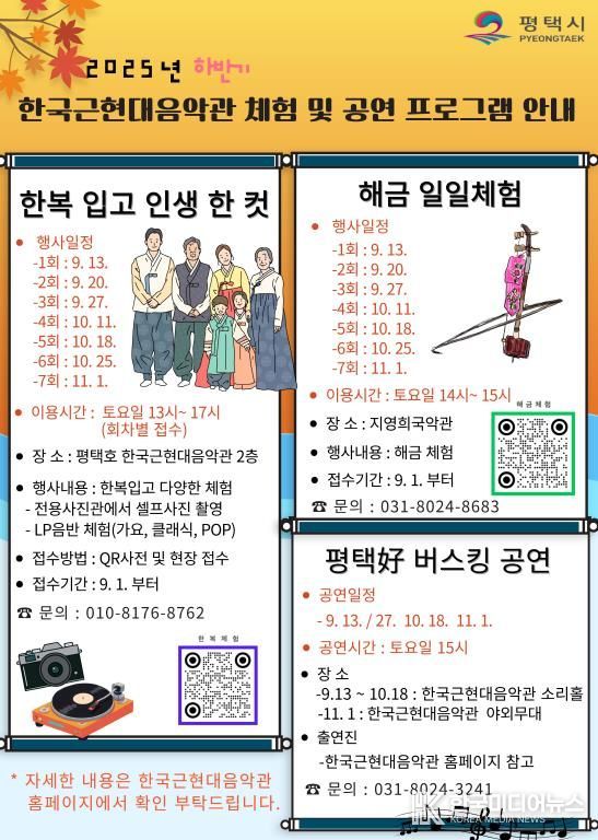 [ 한국미디어뉴스 이보영 기자 ] 평택시 한국근현대음악관은 오는 9월 13일부터 11월 1일까지 시민과 방문객이 함께 참여할 수 있는 하반기 체험·공연 프로그램을 운영한다고 밝혔다.