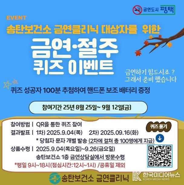송탄보건소 금연클리닉에서 운영하는 이번 퀴즈 이벤트는 8월 25일부터 9월 12일까지 진행되며, 퀴즈 정답자 중 100명을 추첨해 금연 홍보물을 제공한다.