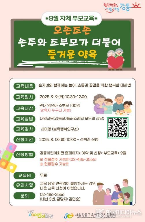 두 교육 모두 90분 동안 진행되며, 강동구 내 미취학 영유아를 양육하는 조부모와 부모라면 누구나 무료로 참여할 수 있다. 신청은 강동어린이회관 누리집(홈페이지)에서 가능하다.
