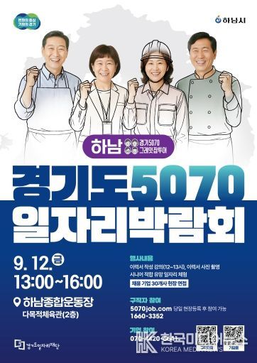 [ 한국미디어뉴스 김서안 기자 ] 경기도와 경기도일자리재단은 50~70대 중장년층의 재취업을 지원하기 위해 오는 9월 12일, 하남종합운동장 다목적체육관에서 ‘2025 경기도 5070 일자리박람회 in 하남’을 개최한다.