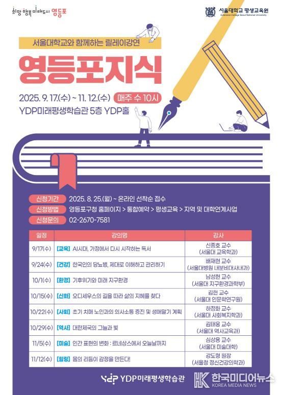 최호권 영등포구청장은 “서울대 교수진과 함께하는 명강의를 가까이서 들을 수 있는 소중한 기회가 될 것”이라며 “앞으로도 구민들이 지속적으로 배우고 성장할 수 있도록 다양한 학습 기회를 확대해 나가겠다”라고 전했다.