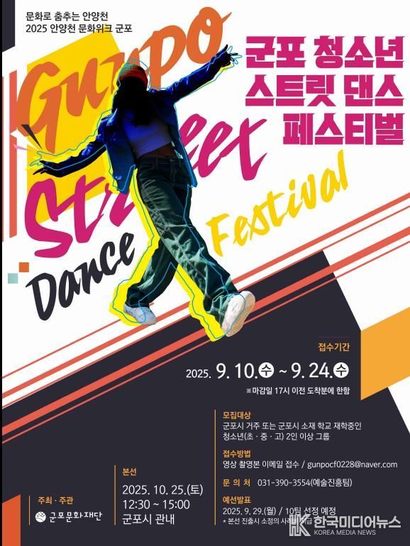 [ 한국미디어뉴스 이보영 기자 ] 군포문화재단에서는 ‘문화로 춤추는 안양천 : 2025 안양천 문화위크 군포’ 프로그램의 일환으로 ‘군포 청소년 스트릿댄스 페스티벌’을 개최한다.