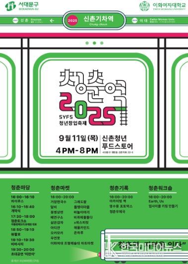 [ 한국미디어뉴스 이보영 기자 ] 서대문구가 이달 11일 오후 4∼8시 신촌 청년푸드스토어(신촌역로 22-5)에서 이화여대와 함께 ‘청춘역 2025’를 개최한다.