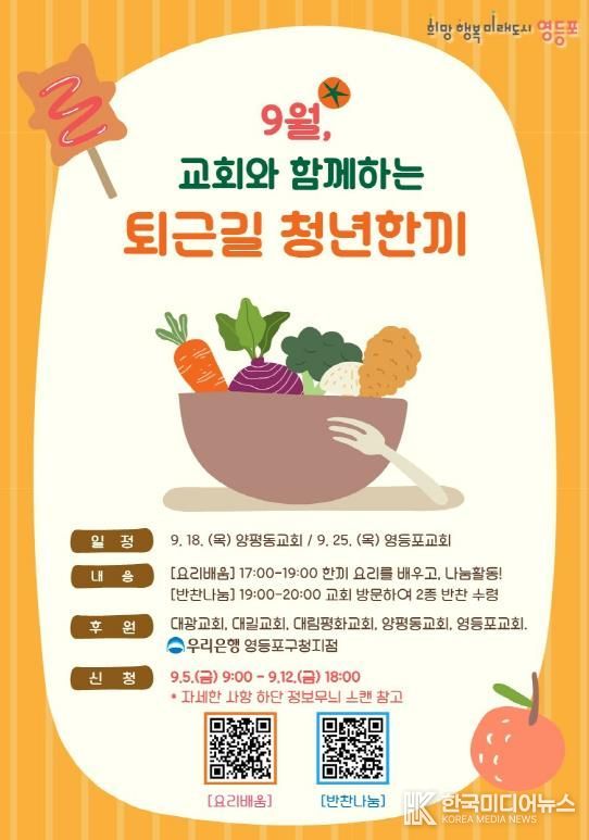 [ 한국미디어뉴스 이보영 기자 ] 영등포구가 청년들의 건강한 식습관 형성을 지원하기 위해 관내 교회 5곳과 함께 ‘퇴근길 청년한끼’ 사업을 운영하고, 오는 12일까지 참여자를 모집한다고 밝혔다.