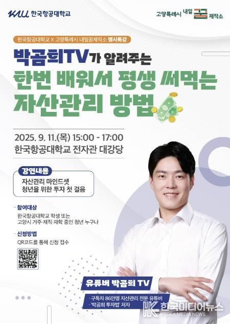[ 한국미디어뉴스 문상수 기자 ] 고양특례시가 오는 11일 오후 3시 한국항공대학교 전자관 1층 대강당에서 86만 구독자를 보유한 금융 유튜버이자 베스트 셀러 작가인 ‘박곰희TV’를 초청해 명사특강‘한번 배워서 평생 써먹는 자산관리 방법’을 개최한다고 밝혔다.