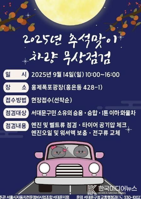 [ 한국미디어뉴스 이보영 기자 ] 서대문구가 명절을 맞는 구민들의 안전한 차량 이용을 위해 ‘서울시 자동차전문정비사업조합 서대문지회’와 함께 ‘2025년 추석맞이 차량 무상점검’을 실시한다.