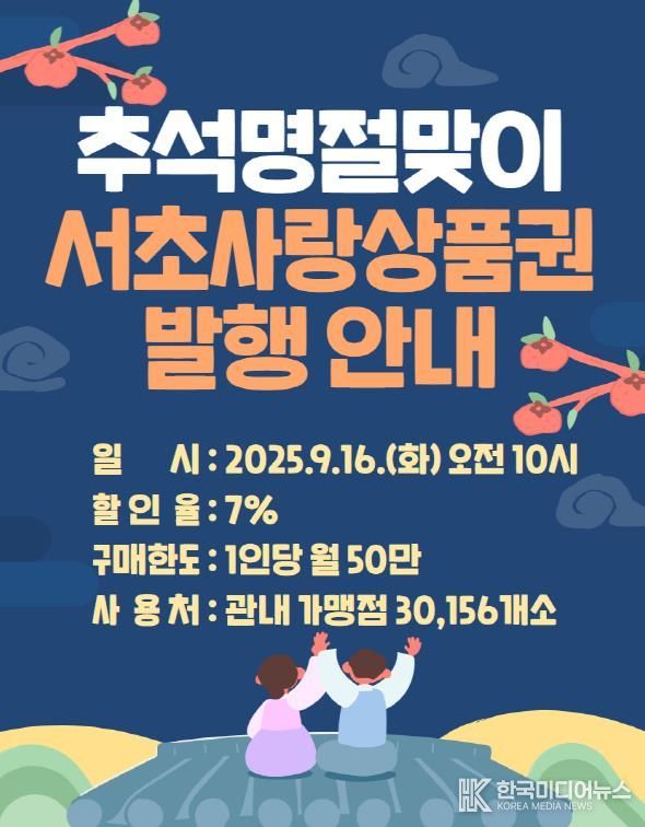 [ 한국미디어뉴스 이보영 기자 ] 서울 서초구는 다가오는 추석을 맞아 주민들의 장바구니 부담을 덜고 지역경제를 활성화하기 위해 서초사랑상품권 할인율을 기존 5%에서 7%로 대폭 확대해 발행한다고 밝혔다.