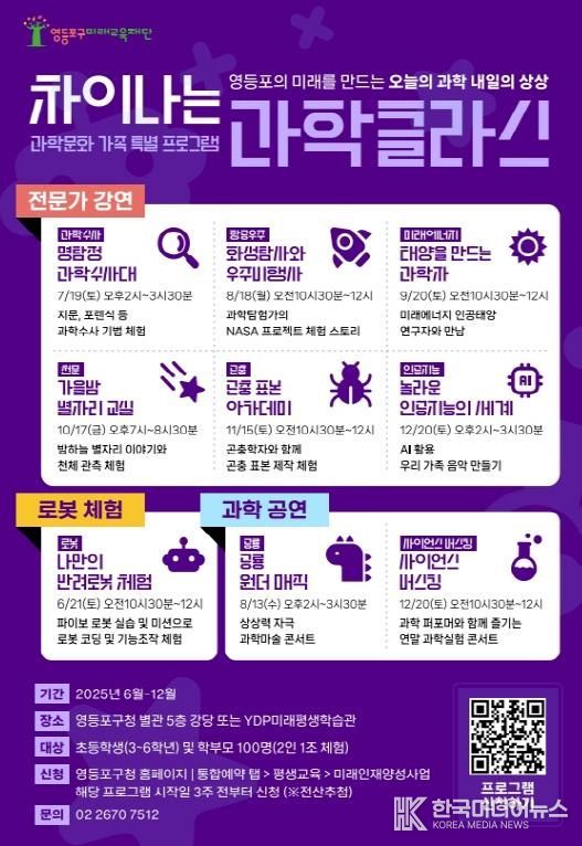 영등포구 미래교육재단 관계자는 “자녀 진로 설계에 필요한 전문 지식을 얻고 생활 속에서 과학을 즐기는 기회가 될 것”이라며 “앞으로도 시대 흐름에 맞는 다양한 프로그램을 통해 구민 모두가 함께 성장할 수 있도록 지원하겠다”라고 전했다.