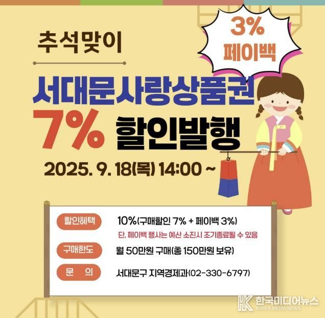 [ 한국미디어뉴스 이보영 기자 ] 서대문구가 추석 명절을 앞두고 지역사회 내 소비 촉진을 통한 소상공인 매출 증대와 민생경제 활성화를 위해 이달 18일 오후 2시부터 모바일 서대문사랑상품권을 발행한다.