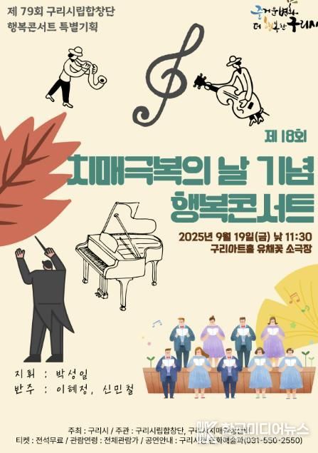 [ 한국미디어뉴스 김서안 기자 ] 구리시는 오는 9월 19일 오전 11시 30분부터 오후 12시 30분까지 구리아트홀 유채꽃 소극장에서'제18회 치매 극복의 날 기념 행복 콘서트'를 개최한다고 밝혔다.