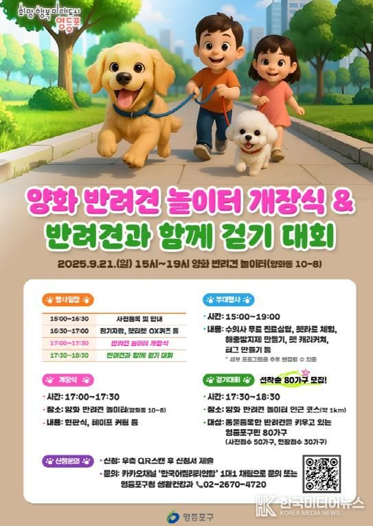 [ 한국미디어뉴스 이보영 기자 ] 영등포구가 오는 9월 21일 안양천(양화교 아래 어린이 교통안전체험장 옆)에 새로 조성된 양화 반려견 놀이터의 개장행사와 ‘반려견과 함께 걷기 대회’를 연다고 밝혔다.