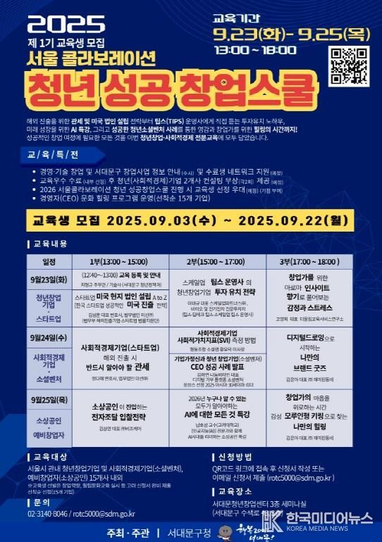 이성헌 서대문구청장은 “창업 현장에서 바로 도움이 될 수 있는 실질적이고 체계적인 콘텐츠로 청년 성공 창업스쿨을 준비했다”며 “청년 창업가와 사회적경제기업들을 위한 도약의 기회가 될 것으로 기대한다”고 말했다.