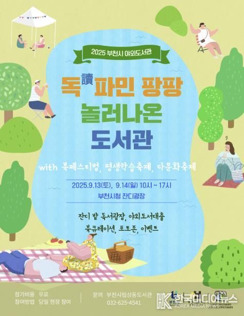 [ 한국미디어뉴스 김만길 기자 ] 부천시는 책과 자연 속 휴식을 함께 누릴 수 있는 ‘놀러나온 도서관’ 행사를 9월 13일과 14일, 양일간 오전 10시부터 오후 5시까지 부천시청 잔디광장에서 개최한다. 이번 행사는 ‘독讀파민 팡팡, 놀러나온 도서관’을 주제로 시민들이 일상에서 독서를 더욱 친근하게 접할 수 있도록 마련됐다.