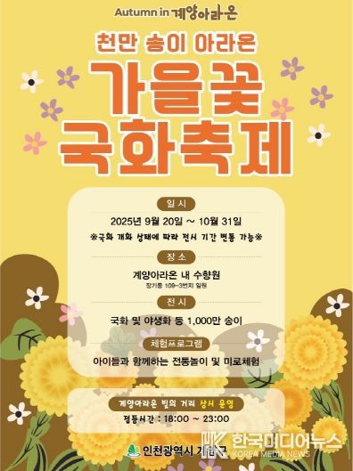[ 한국미디어뉴스 황영수 기자 ] 인천광역시 계양구는 인천9경 계양아라온에서 오는 9월 20일부터 10월 31일까지 ‘가을꽃 국화축제’를 개최한다고 밝혔다.