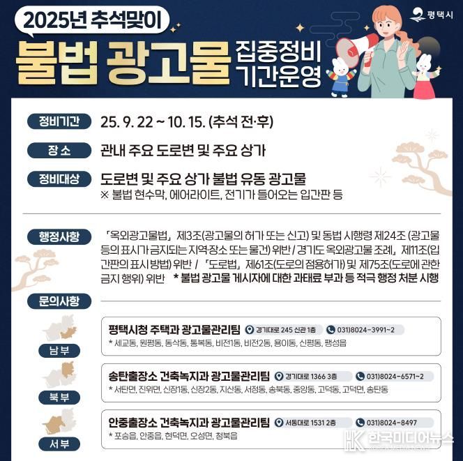 [ 한국미디어뉴스 이보영 기자 ] 평택시는 민족 최대의 명절인 ‘25년 추석을 맞아 불법 광고물 집중 정비 기간을 운영한다고 11일 밝혔다.