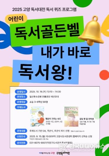 [ 한국미디어뉴스 문상수 기자 ] 고양특례시는 오는 10월 18일 일산호수공원 한울광장에서 열리는 ‘2025 고양 독서대전’ 본행사 프로그램으로 ‘어린이 독서골든벨 : 내가 바로 독서왕’을 개최한다.