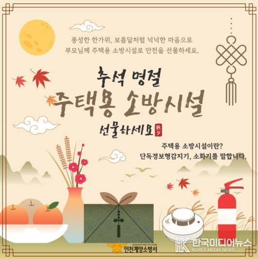 [ 한국미디어뉴스 황영수 기자 ] 계양소방서는 추석 명절을 앞두고 화재로부터 안전한 명절을 보내기 위해 ‘주택용 소방시설 선물하기’를 홍보한다고 3일 밝혔다.