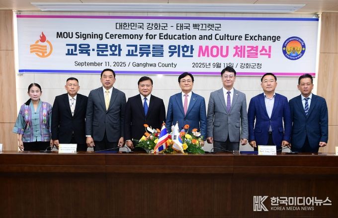 [ 한국미디어뉴스 이원희 기자 ] 강화군은 지난 11일 태국 논타부리주 빡끄렛군(시장 위차이 반다삭)과 교육·문화 교류 협력을 위한 양해각서(MOU)를 체결했다.
