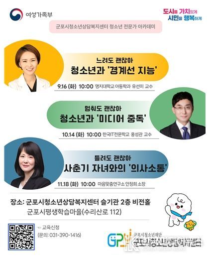 [ 한국미디어뉴스 이보영 기자 ] 군포시청소년재단 군포시청소년상담복지센터는 오는 9월 16일 청소년상담복지센터(수리산로 112)에서 ‘청소년의 경계선 지능’을 주제로 한 전문교육을 실시한다.