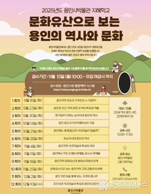 [ 한국미디어뉴스 이원영 기자 ] 용인특례시는 9월 16일부터 12월 10일까지 용인시박물관에서 인문학 강좌 ‘문화유산으로 보는 용인의 역사와 문화’를 총 13회 운영한다고 15일 밝혔다.