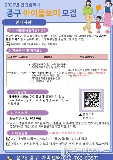 [ 한국미디어뉴스 최치남 기자 ] 인천중구가족센터는 지역 내 양육 부담을 줄이고 아이의 안전한 성장을 지원하기 위해 2025년 3차 ‘아이돌보미 활동가’ 모집을 추진한다고 15일 밝혔다.