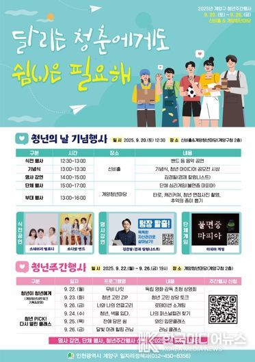 [ 한국미디어뉴스 황영수 기자 ] 인천광역시 계양구는 청년의 날(9월 셋째 주 토요일)을 맞아, 오는 9월 20일부터 26일까지 청년주간행사를 운영한다고 밝혔다.