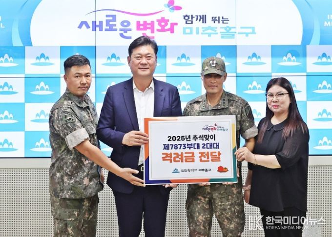 [ 한국미디어뉴스 최치남 기자 ] 인천 미추홀구는 다가오는 추석 명절을 맞아 지난 12일 구청장실에서 국토방위와 국가안보를 위해 노력하는 군 장병들의 노고를 격려하기 위해 관교동 승학산에 소재한 육군 제7873부대 2대대에 격려금을 전달했다.