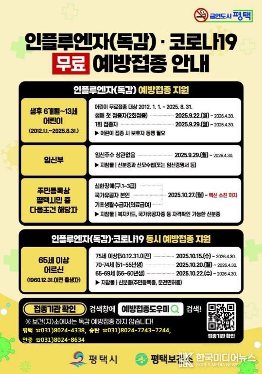 [ 한국미디어뉴스 이보영 기자 ] 평택시는 오는 22일부터 2025-2026 절기 인플루엔자(독감) 무료 예방접종을 지정된 위탁의료기관에서 실시한다고 밝혔다.