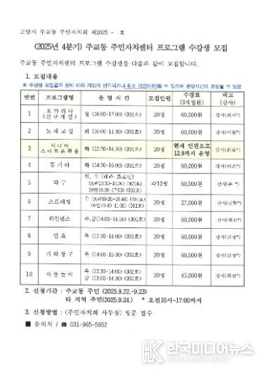 [ 한국미디어뉴스 문상수 기자 ] 고양특례시 덕양구 주교동 주민자치회는 오는 9월 22일부터 24일까지 2025년 4분기 주민자치센터 문화강좌 프로그램 수강생을 모집한다.