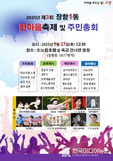 [ 한국미디어뉴스 문상수 기자 ] 고양특례시 일산동구 장항1동 주민자치회는 오는 27일, 고양 소노캄호텔과 빛마루 방송지원센터 사이 광장(장항동 1877번지)에서 ‘2025년 장항1동 한마음축제·주민총회’를 개최한다고 밝혔다.