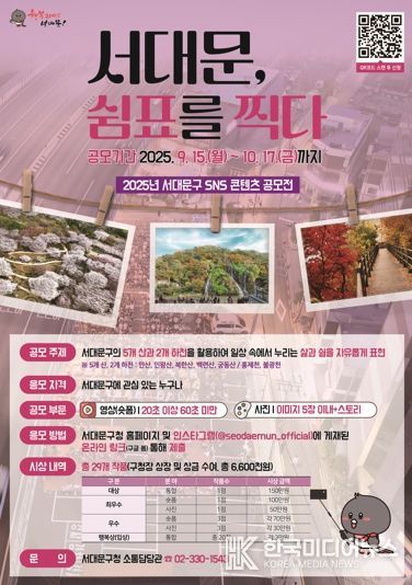 [ 한국미디어뉴스 이보영 기자 ] 서대문구가 일상 가운데 누리는 지역의 자연 명소를 SNS로 널리 알리기 위해 ‘2025 SNS 콘텐츠 공모’를 진행한다.