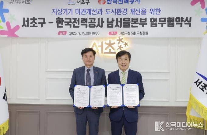 [ 한국미디어뉴스 이보영 기자 ] 서울 서초구가 15일 서초구청에서 한국전력 남서울본부와 ‘지상기기 미관 개선과 도시환경 개선을 위한 업무협약’을 체결했다고 밝혔다. 이번 협약은 두 기관이 상호 협력하여 서초구 공공보도상 지상기기 정비를 통해 도시환경을 개선하고 쾌적한 보행환경을 만들기 위해 추진됐다.