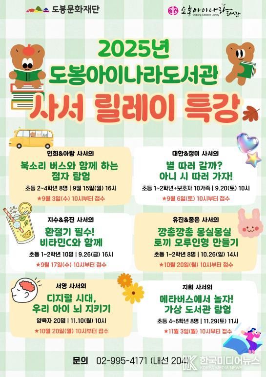 [ 한국미디어뉴스 이보영 기자 ] 서울 도봉구도봉아이나라도서관이 ‘사서 릴레이 특강’을 운영한다.