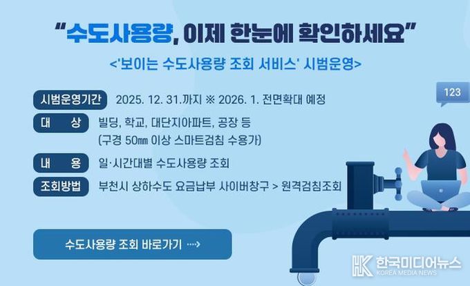 [ 한국미디어뉴스 김만길 기자 ] 부천시는 스마트검침시스템을 기반으로 한 ‘보이는 수도사용량 조회 서비스’를 이달부터 오는 12월까지 시범 운영한다고 16일 밝혔다.