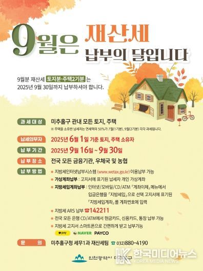 [ 한국미디어뉴스 최치남 기자 ] 인천 미추홀구는 9월 정기분 재산세(토지분 및 주택 2기분) 518억 원, 21만 2천여 건을 부과했다고 16일 밝혔다.