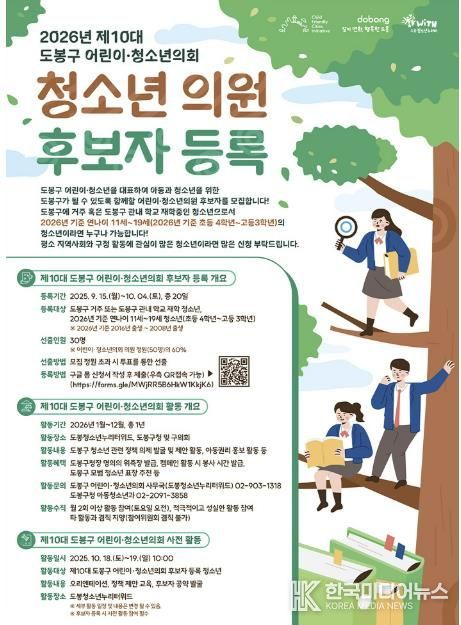 [ 한국미디어뉴스 이보영 기자 ] 서울 도봉구가 10월 4일까지 제10대 도봉구 어린이·청소년의회 의원 후보자를 공개 모집한다.