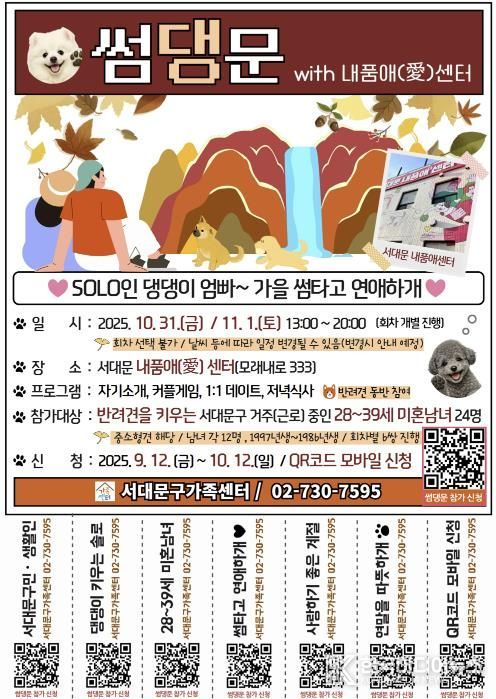 [ 한국미디어뉴스 이보영 기자 ] 서대문구는 서대문구가족센터가 10월 31일과 11월 1일 서대문 내품애(愛)센터(모래내로 333)에서 반려견을 키우는 미혼남녀 만남 행사 ‘썸댕문 with 내품애센터’를 개최한다고 17일 밝혔다.