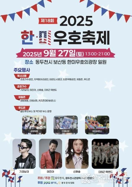 [ 한국미디어뉴스 김서안 기자 ] 동두천시는 오는 9월 27일 보산동 관광특구 한미우호광장에서 ‘제18회 한미우호축제’를 개최한다. 이번 행사는 동두천시와 동두천관광특구 상가연합회가 공동 주최하며, 지역 주민과 주한미군 간 우호 증진과 관광특구 활성화를 목표로 마련됐다.