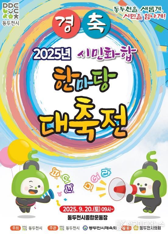 [ 한국미디어뉴스 김서안 기자 ] 동두천시는 오는 9월 20일(토) 동두천 종합운동장에서 '2025 시민화합 한마당 대축전'을 성대히 개최한다. 행사는 동두천시가 주최하고 동두천시와 동두천시체육회가 공동 주관한다.