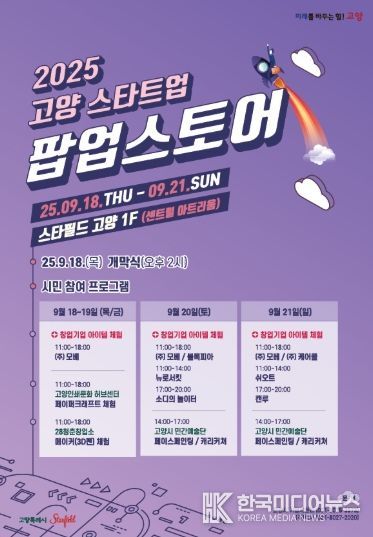 [ 한국미디어뉴스 문상수 기자 ] 고양특례시는 오는 18일부터 21일까지 4일간 스타필드 고양에서‘2025 고양 스타트업 팝업스토어’를 개최한다고 밝혔다.