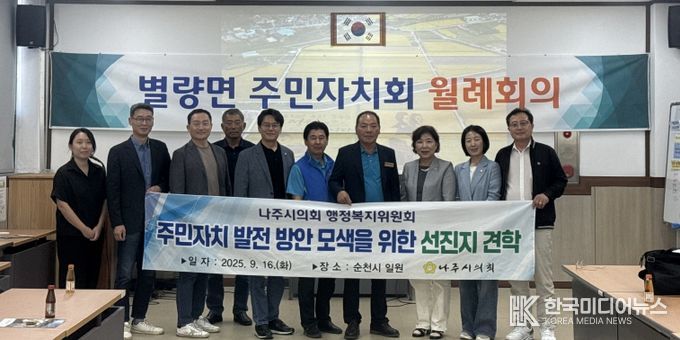 [ 한국미디어뉴스 이종철 기자 ] 나주시의회 행정복지위원회(위원장 조영미)는 지난 16일 순천시 주암면 문성마을, 마을공동체지원센터, 변량면 주민자치회를 방문하여 주민자치회 운영 사례와 성과를 청취하고, 향후 나주시 주민자치 발전 방안을 모색하는 뜻깊은 시간을 가졌다고 17일 밝혔다.